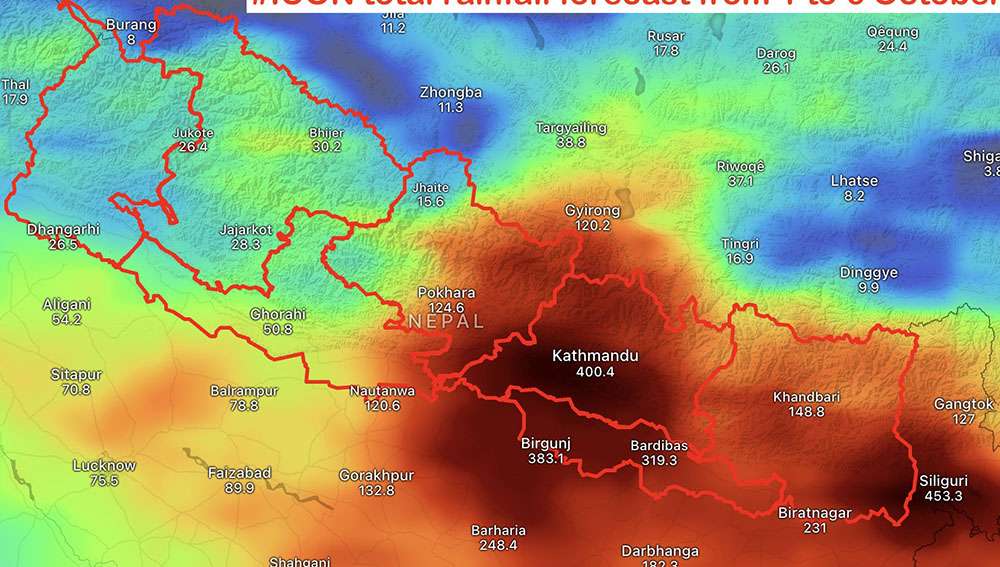 काठमाडौं । जल तथा मौसम विज्ञान विभागले असोज १७ गतेदेखि २० गतेसम्म भारी वर्षा हुने प्रक्षेपण गरेपछि राष्ट्रिय विपद् जोखिम न्यूनीकरण तथा व्यवस्थापन प्राधिकरणले अलर्ट जारी गरेको छ । विभागका अनुसार कोशी, मधेश, बागमती, गण्डकी र लुम्बिनी प्रदेशमा मध्यमदेखि भारी वर्षाको सम्भावना रहेको छ ।