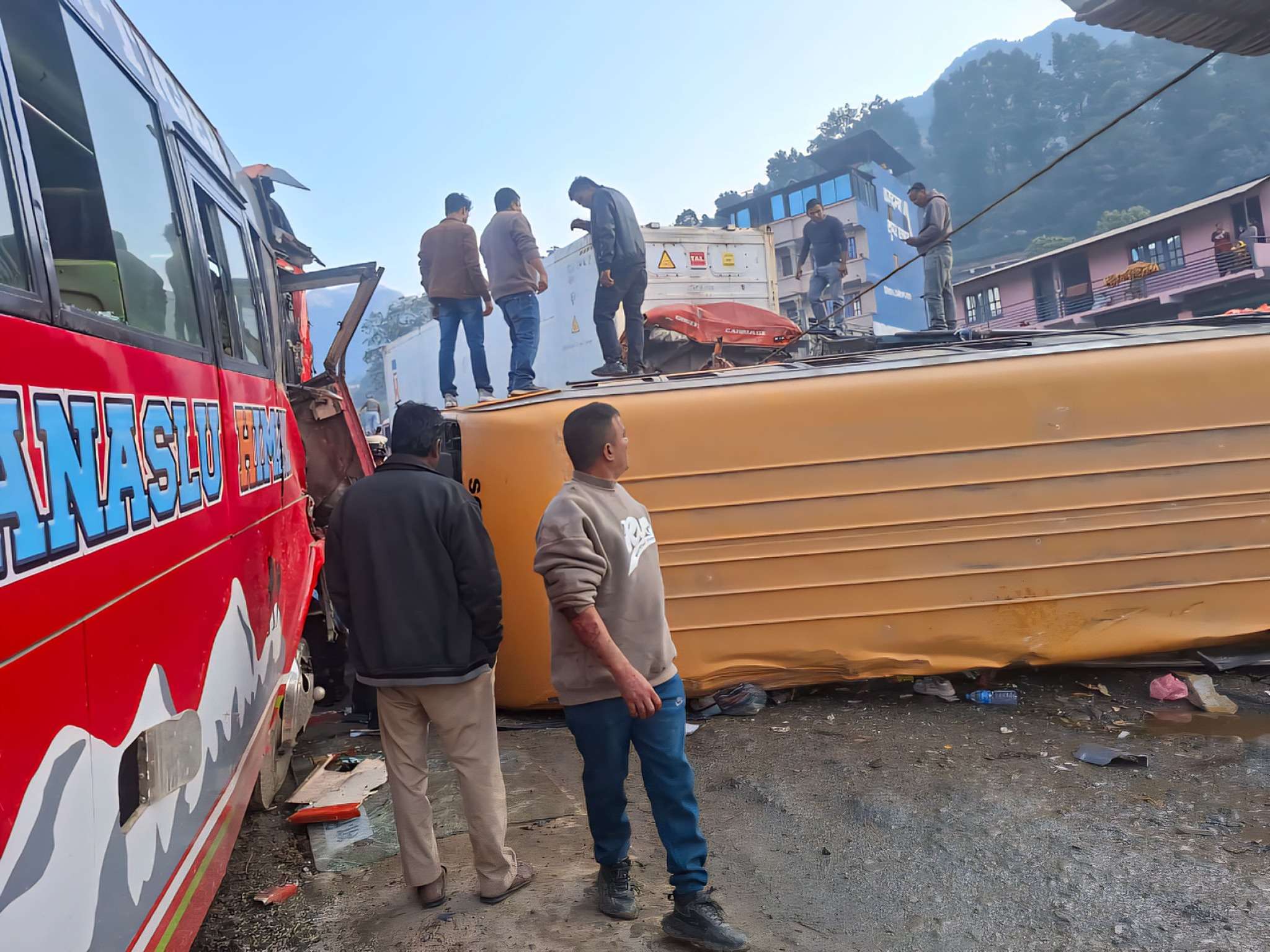 प्रहरीका अनुसार एक स्कुल बस, दुई सार्वजनिक यातायात, दुई ट्रक, एक भारतीय नम्बर प्लेटको गाडी र एक मोटरसाइकल एक आपसमा ठोक्किएको हो ।