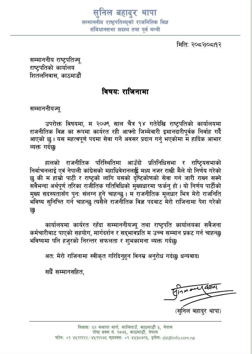 काठमाडौं । राष्ट्रपति रामचन्द्र पौडेलका राजनीतिक सल्लाहकार सुनिलबहादुर थापाले पदबाट राजीनामा दिएका छन् ।  ०७९ फागुनमा पौडेल राष्ट्रपति निर्वाचित भएपछि उनको सल्लाहकार बनेका थापाले राजीनामा दिएको राष्ट्रपतिको सचिवालयले पुष्टि गरेको छ । थापा २०७८ सालमा भएको नेपाली कांग्रेसको १४औँ महाधिवेशनमा खुलातर्फ केन्द्रीय सदस्य निर्वाचित भएका थिए ।