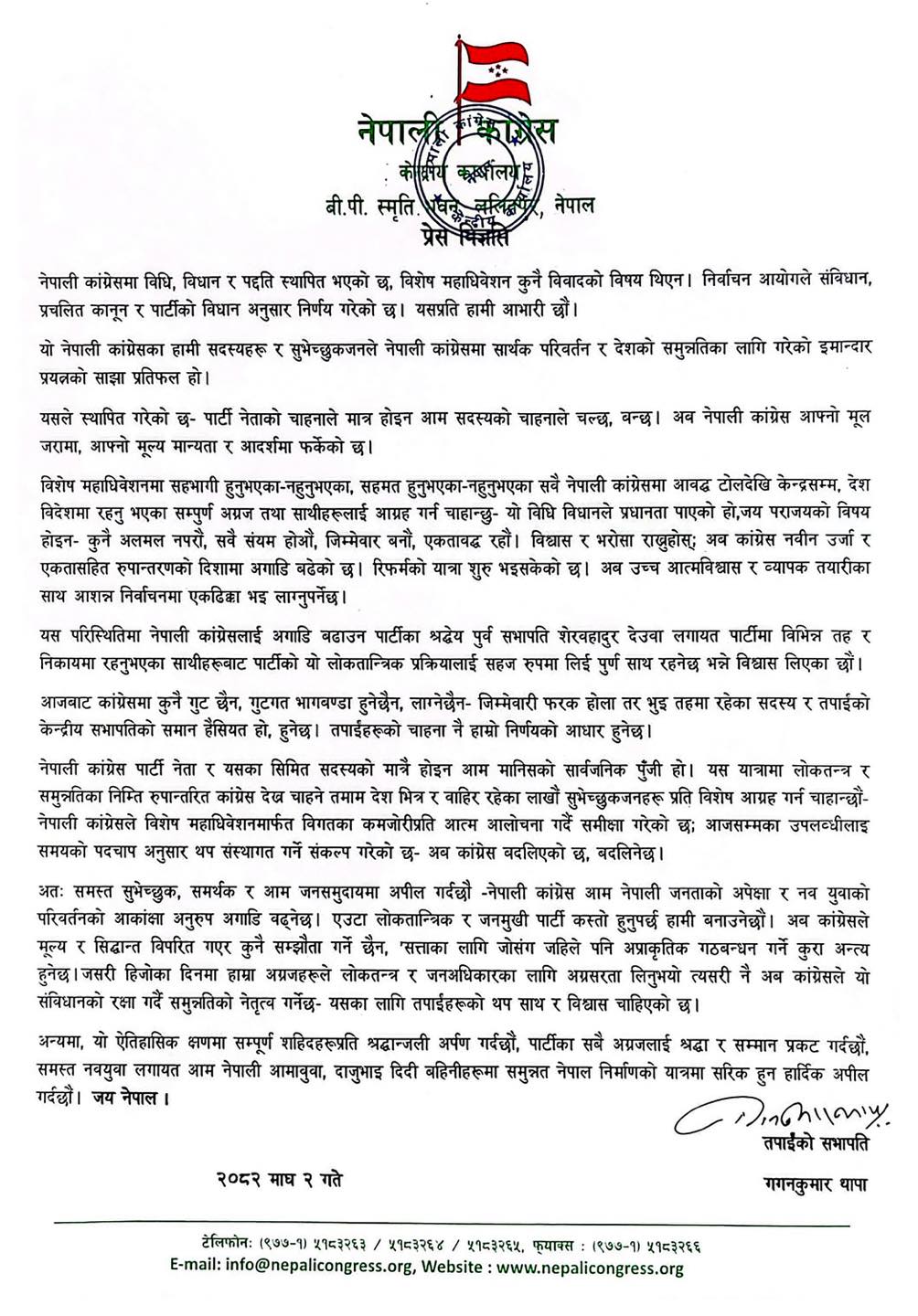 ‘नेपाली कांग्रेसमा विधि, विधान र पद्धति स्थापित भएको छ, विशेष महाधिवेशन कुनै विवादको विषय थिएन, निर्वाचन आयोगले संविधान, प्रचलित कानुन र पार्टीको विधानअनुसार निर्णय गरेको छ, यसप्रति हामी आभारी छौँ’, उनले भने। उनले कांग्रेसका सदस्य र शुभेच्छुकजनले नेपाली कांग्रेसमा सार्थक परिवर्तन र देशको समुन्नतिका लागि गरेको इमान्दार प्रयत्नको साझा प्रतिफल भएको उल्लेख गरे।