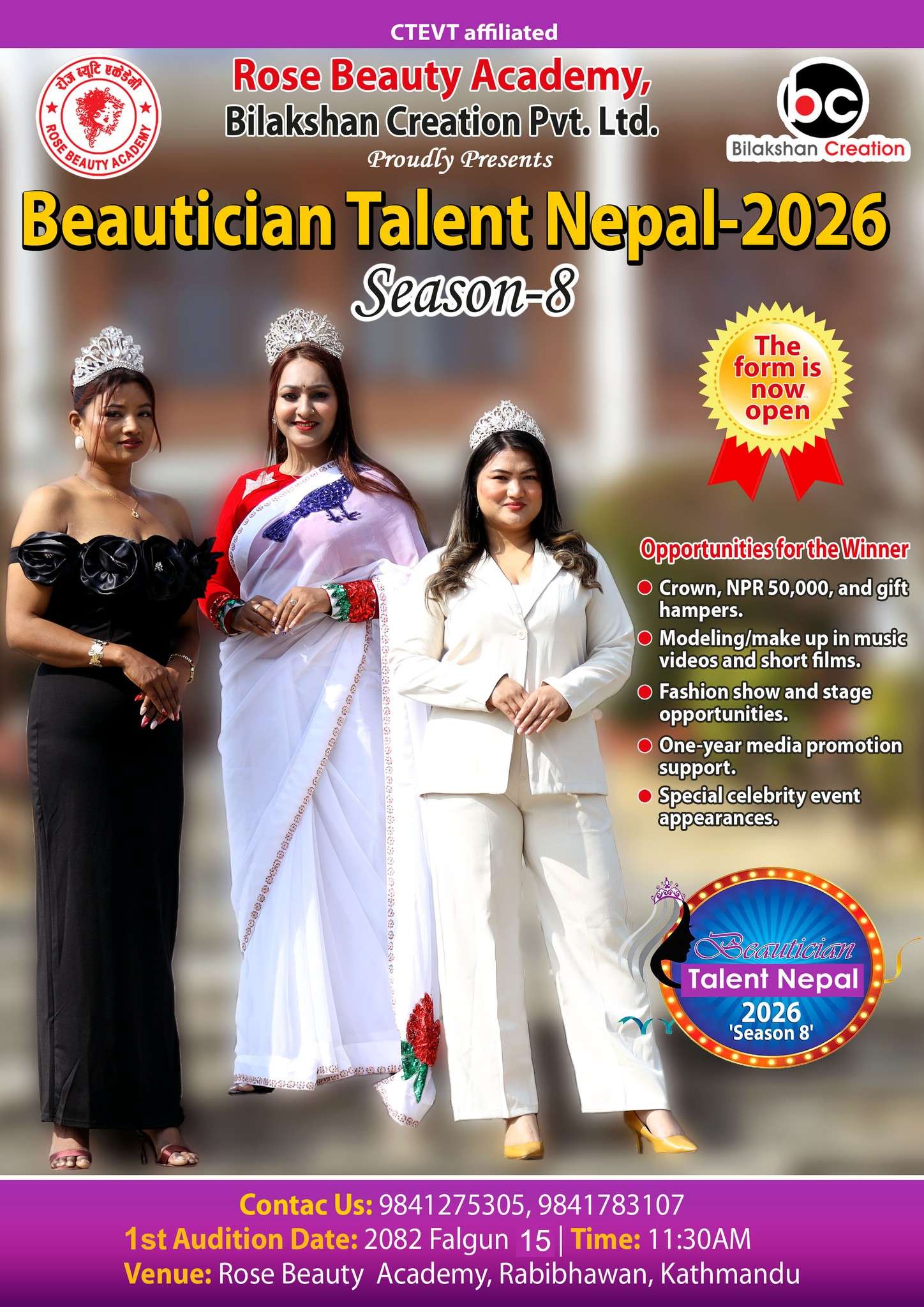 काठमाडौँ- रोज ब्युटी एकेडेमी र विलक्षण क्रियसन प्रा.लि.को आयोजनामा ब्युटिसियनहरुको व्यक्तित्व विकास र प्रतिभा प्रस्तुतिको लागि विगत ८ वर्षदेखि सौन्दर्य प्रतियोगिता ‘ब्युटिसियन ट्यालेन्ट नेपाल’ हुँदै आएको छ । यसै बिच ‘ब्युटिसियन ट्यालेन्ट नेपाल २०२६’ सिजन – ८ को फारम खुलेको छ । यो प्रतियोगिताको ग्रान्ड फिनाले आगामी चैतको अन्तिम साता काठमाडौँमा आयोजना हुँदैछ । यो प्रतियोगितामा सहभागी हुने प्रतियोगिहरुका लागि फारम खुला गरिएको हो ।