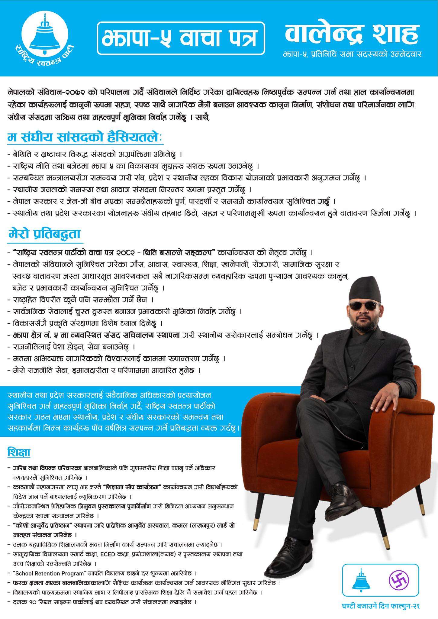 झापा । राष्ट्रिय स्वतन्त्र पार्टी (रास्वपा) का वरिष्ठ नेता तथा झापा क्षेत्र नम्बर ५ का प्रतिनिधि सभा सदस्य उम्मेदवार बालेन्द्र शाह (बालेन) ले सोमबार आफ्नो चुनावी प्रतिबद्धता पत्र (वाचापत्र) सार्वजनिक गरेका छन् । आसन्न निर्वाचनका लागि सार्वजनिक गरिएको उक्त वाचापत्रमा भ्रष्टाचार नियन्त्रण, शिक्षा, स्वास्थ्य र सुकुम्वासी समस्या समाधानलाई उच्च प्राथमिकता दिइएको छ ।