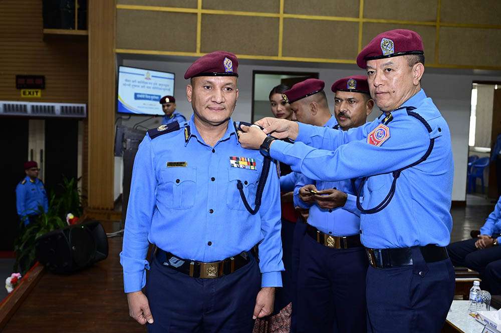 काठमाडौं । नेपाल सरकार गृहमन्त्रीस्तरको २०८२ कात्तिक १७ गतेको निर्णयअनुसार प्रहरी वरिष्ठ उपरीक्षकबाट प्रहरी नायव महानिरीक्षक पदमा पदोन्नति भएका ५ जना प्रहरी नायव महानिरीक्षक (डिआइजी) हरू दर्ज्यानी चिन्हद्वारा सुशोभित भएका छन् ।