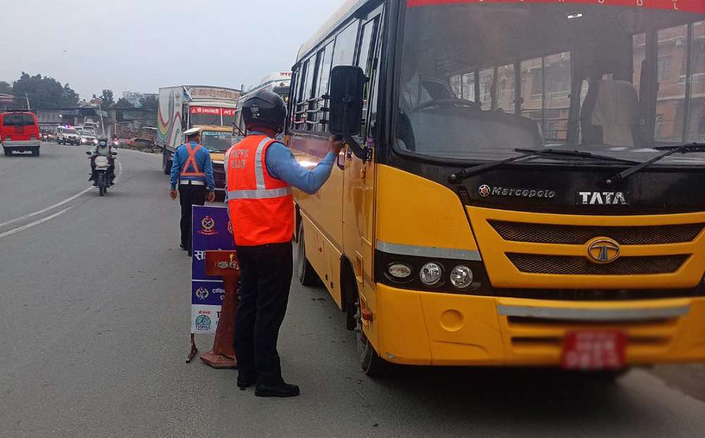 मादक पदार्थ सेवन गरि सार्वजनिक भाडाका सवारी साधन चलाउने २ जना, स्कुल बसका चालक २ जना र माईक्रो बसका चालक १ जना गरी जम्मा ५ जना चालक र लागुऔषध सेवन गरी सवारी साधन चलाउदै गरेका भाडा बसका ४ जना चालकलाई ट्राफिक प्रहीले नियन्त्रणमा लिएको हो ।