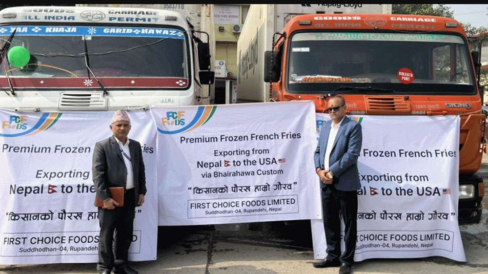 रुपन्देहीमा अवस्थित फूट च्वाइस फुड्स प्रालिबाट अमेरिकास्थित जेन्टको एलएलसीलाई दुई कन्टेर अर्थात् ४३ हजार पाँच सय २० किलोग्राम फ्रोजन फ्रेन्च फ्राइज निर्यात भएको हो ।