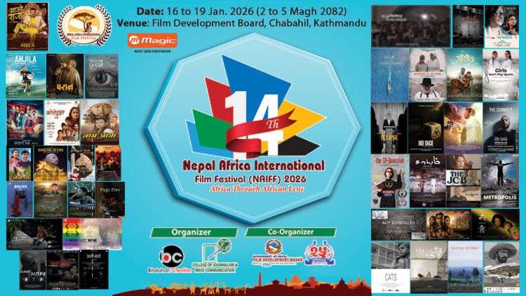 आज शुक्रबार २ माघबाट सोमबार ५ माघसम्म ४ दिन १४ औँ संस्करणको ‘नेपाल अफ्रिका अन्तर्राष्ट्रिय चलचित्र महोत्सव–२०२६’ आयोजना हुने भएको छ । महोत्सवमा यसपटक नेपालसहित २० देशका ४३ वटा चलचित्र छनौट भएका छन् । चलचित्र विकास बोर्ड चावहिल, काठमाडौँमा आयोजना हुने यो महोत्सवमा नेपाली समूहमा करिब चार दर्जन भन्दा बढी चलचित्र, वृत्तचित्र एवम् लघु चलचित्रबाट २० वटा चयन गरिएको महोत्सव निर्देशन डब्बु क्षत्रीले बताए ।