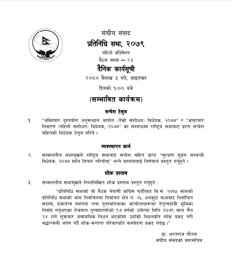 त्यस्तै आज सभामुखले राष्ट्रिय सभाबाट सन्देशसहित प्राप्त ‘सुरक्षण मुद्रा सम्बन्धी विधेयक २०७७ माथि छलफल गरियोस्’ भन्ने प्रस्ताव निर्णयार्थ प्रस्तुत गर्ने सम्भावित कार्यसूची छ। त्यस्तै पूर्वसांसद तेजमान तुम्वाहाम्फेको निधनप्रति शोक प्रस्ताव प्रस्तुत गर्ने कार्यसूचीमा उल्लेख छ।