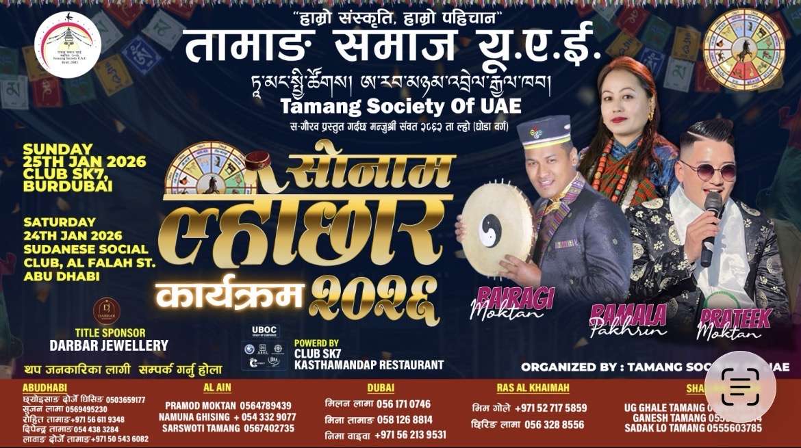 युएई-१९ जनवरी " तामाङ समाज युएईको शान, तामाङ संस्कृति तामाङ पहिचान” भन्ने मूल नाराका साथ समाजले हरेक वर्ष सोनाम ल्होछारलाई विशेष धार्मिक तथा सांस्कृतिक महत्वका साथ मनाउँदै आएको छ। सोनाम ल्होछार तामाङ समुदायको नयाँ वर्ष मात्र नभई धर्म, संस्कार, प्रकृति र पूर्वजप्रतिको सम्मान झल्किने पर्व हो। यस अवसरमा लामा गुरुहरूको आशीर्वचन, पूजापाठ, सामूहिक प्रार्थना, परम्परागत भेषभूषा, सांस्कृतिक नृत्य तथा मौलिक गीत–संगीतमार्फत समुदायको पहिचान उजागर गरिन्छ।